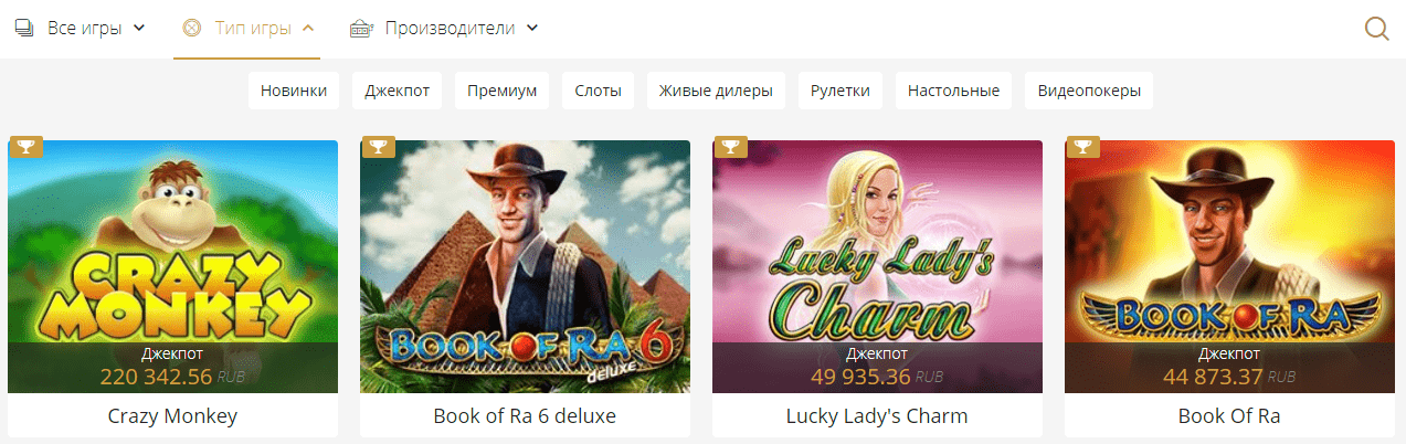 - Слоты. Категория представлена игровыми автоматами разнообразных тематик — здесь их более ста.