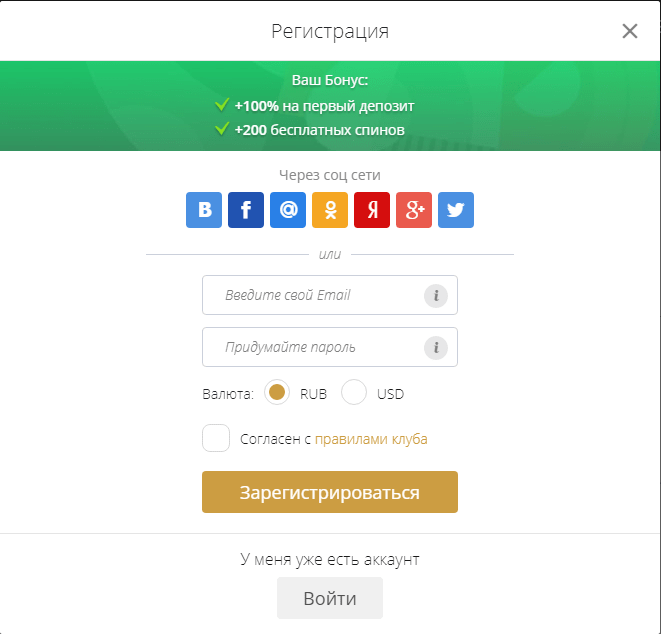 Для того чтобы зарегистрироваться на азартном портале, не понадобится много времени. В соответствующем разделе следует заполнить небольшую форму, указав правдивые данные. После этого понадобиться пройти верификацию — посредством номера телефона или электронной почты. Для ускоренного доступа к сайту онлайн казино можно использовать одну из кнопок доступных соцсетей. Регистрируясь на ресурсе, пользователи должны помнить: игра здесь открыта только совершеннолетним пользователям.