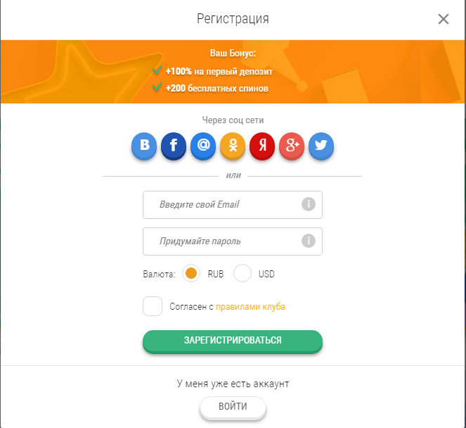 Чтобы зарегистрироваться на азартном ресурсе, понадобится всего несколько минут. Для этого укажите в соответствующей графе корректный имейл-адрес, а также придумайте логин и пароль. Для еще большего упрощения процесса, в соответствующем разделе присутствуют кнопки соцсетей. Нажав на одну из них, можно быстро пройти процесс авторизации.